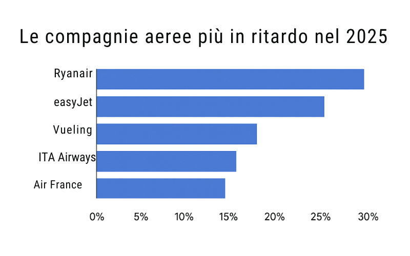 Secondo i dati elaborati nel periodo compreso tra gennaio e agosto 2025, diverse compagnie hanno superato il 25% di voli in ritardo sul totale operato, con picchi in corrispondenza di scioperi, maltempo e sovraccarico infrastrutturale nei principali hub europei.